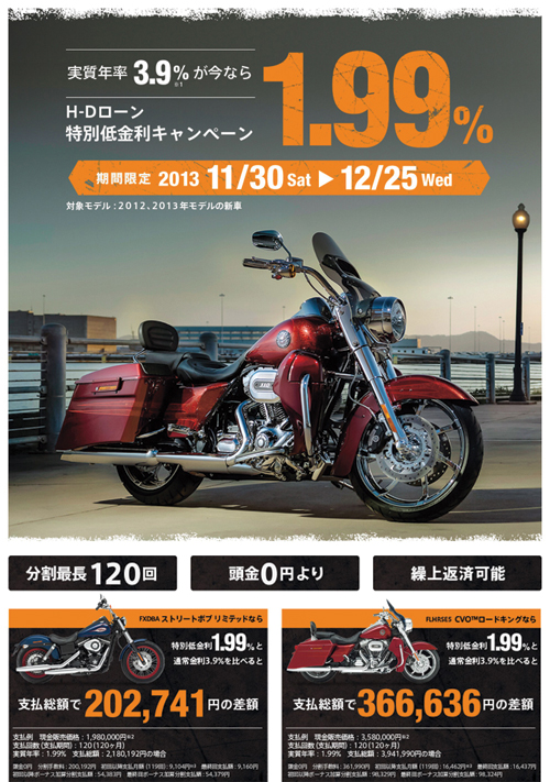 H-Dローン 特別金利キャンペーン 1.99% 詳しくはこちら キャンペーン期間中に2012年モデル、2013年モデルの新車をご成約いただき、2013年12月25日までに納車完了の方にH-Dローンを特別低金利1.99%にてご案内いたします。 ※アレンジプラン・ハーフアッププランは対象外です。