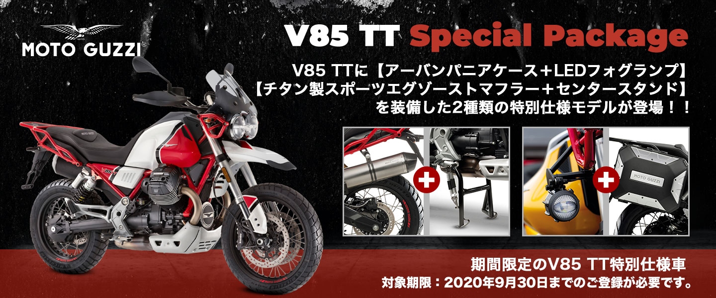 人気の モト・グッツィ V85TT のスペシャルパッケージが発売です。 ① パニアケース&LEDフォグランプ ② Arrow Slip on マフラー&センタースタンド V85 TT プレミアム ¥1,518,000円(消費税込み) V85TT スタンダード ¥1,490,500円(消費税込み) 約10万円お得になっております! この機会にぜひ! 詳しくはお気軽にお問い合わせください。